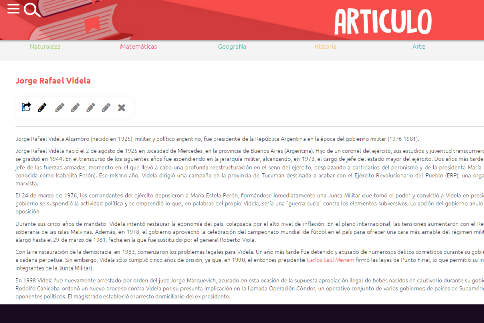 No se utiliza la palabra dictadura. No aparece el término desaparecidos. Los juicios que lo sentenciaron por el genocidio fueron por hechos supuestos. "Supuesta apropiación ilegal de bebés en cautiverio", dice. La periodista de Página Política Luz Alcain tuvo un hallazgo en el portal educativo Magnaplus que desarrolla la empresa Magnaverum para la Municipalidad de Paraná y al que se puede acceder desde la página web oficial: la entrada sobre el dictador Jorge Rafael Videla lo pinta casi como un salvador de la patria.
