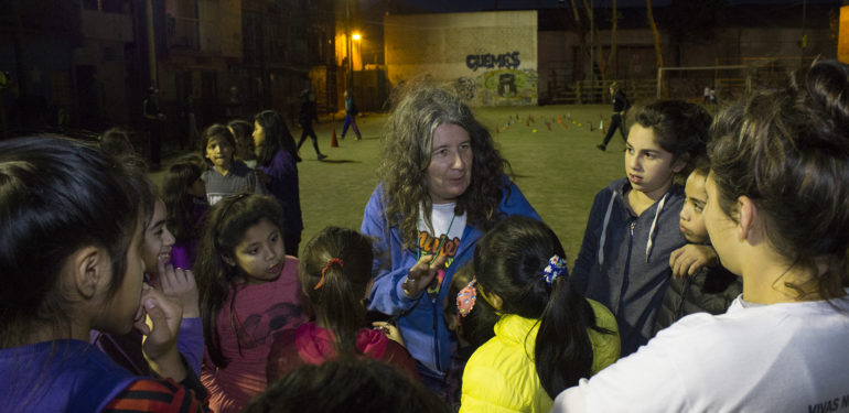 Santino es entrenadora de fútbol y referente del colectivo “La nuestra” de fútbol femenino, y hace más de 10 años que trabaja en la Villa 31. Es una de las personas que más ha promovido el fútbol de mujeres en el país y en el barrio puso a patear la pelota a cientos de pibas de entre seis y 30 y tantos años, con las que ya viajó a jugar a Río de Janeiro (2010), París (2011), México (2012) y Berlín (2015).