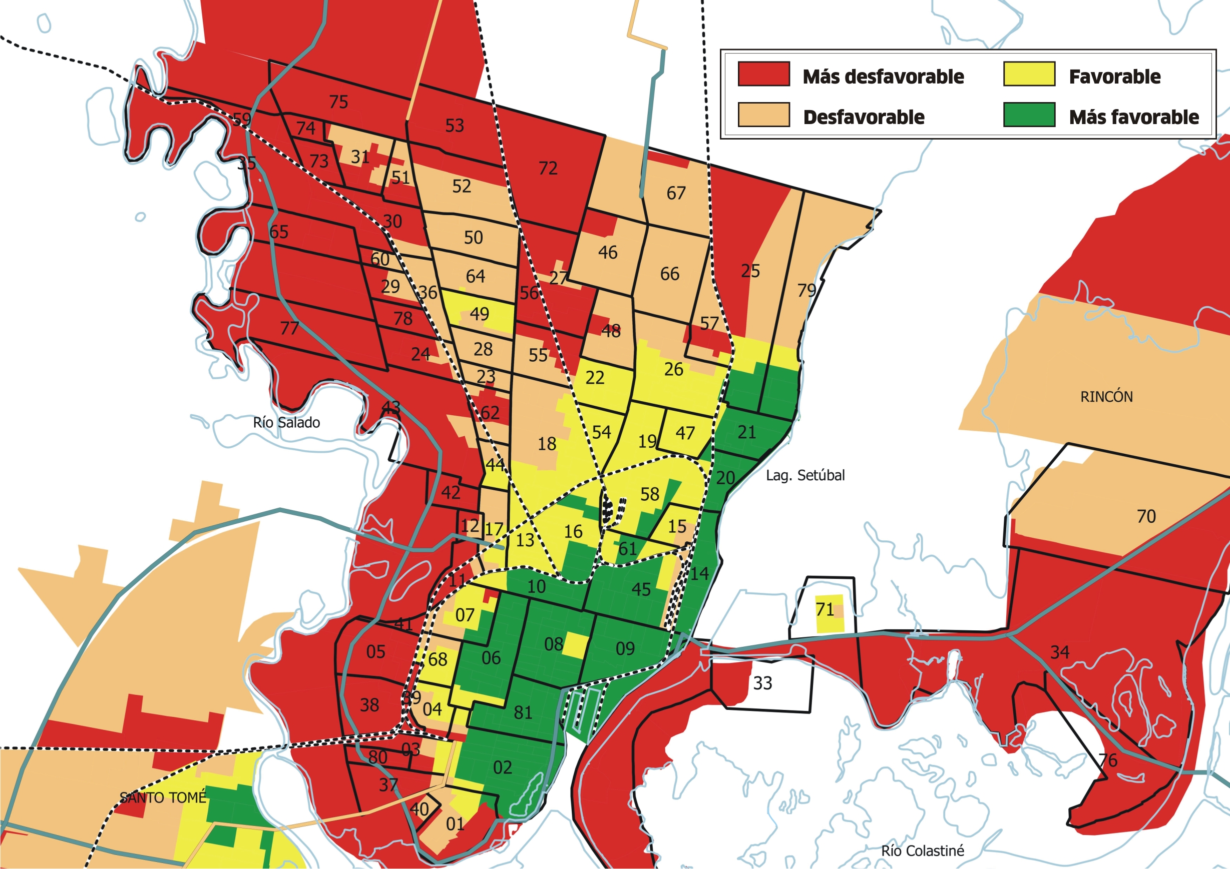 • Las situaciones de mejor estatus no son exclusivas del macrocentro, sino que también se observan zonas de categoría “más favorable” que conviven con zonas muy desfavorables. El caso más notorio es el barrio de Guadalupe que tiene una gran disparidad entre las dos zonas divididas por la vía.