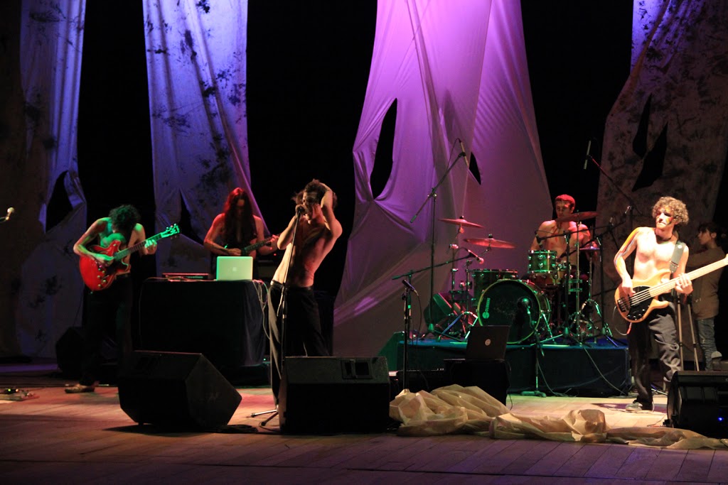 Con una puesta integral, que incluyó una destacada escenografía de telas blancas con manchas de colores, la bailarina Mari de Vega y el ya tradicional maquillaje –esta vez en forma de líneas rojas y azules– que atraviesa y cubre los rostros y torsos de los músicos en sus recitales, exhibieron los 13 temas que conforman los dos discos. Las canciones se sucedieron en el mismo orden que se encuentran en los álbumes, sin dar respiro siquiera para los aplausos, que explotaron con fuerza en el final.