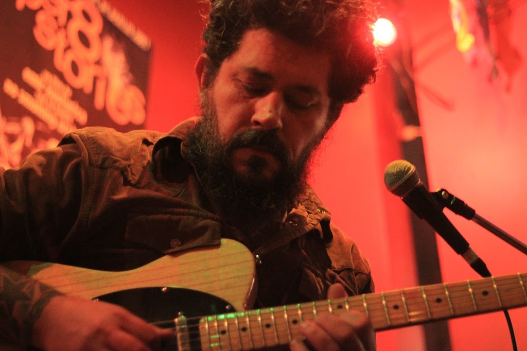 La charla termina y me acomodo en una mesa vecina a la espera del último show de la semana, el del domingo. Serpientes de papel crepé multicolor atraviesan el espacio aéreo del interior del bar, pequeñas lámparas de pared irradian una tibia luz entre avisos de películas de Bertolucci y Tarantino, Spinetta combina con el ambiente en el que está sonando. El broche de las celebraciones se anunció para las 21.00, se retrasó 59 minutos. Pisando las diez de la noche un muchacho barbudo alzó la Telecaster, cuyo clavijero reposaba en la pared, se sentó bajo uno de los focos de colores que estaban colgados allí y, custodiado por los afiches de las películas, soltó el primer acople (y el único) y el primer Mi mayor.