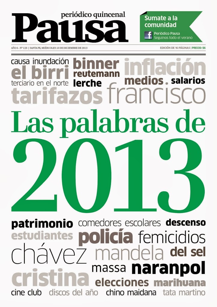 Termina un año caliente. Los recientes acuartelamientos de la Policía, modalidad que se repitió en casi todo el país, son la nota que le faltaba a un 2013 que tuvo de todo: aumentos de impuestos y tarifas, elecciones, conflictos de compleja o nula resolución (el desalojo del Birri, los limpiavidrios) y noticias que conmovieron a toda la población: desde la designación del Papa argentino hasta la muerte de dos líderes como Hugo Chávez y Nelson Mandela. En 2013 también descendió Unión y renunció Germán Lerche en Colón. Un año con debates como el de la despenalización de la marihuana y con conquistas de la participación popular, como la apertura del terciario del norte. Con esta edición, compartimos nuestra agenda propia del 2013 y nos despedimos hasta marzo de 2014. ¡Que empiecen bien el año!