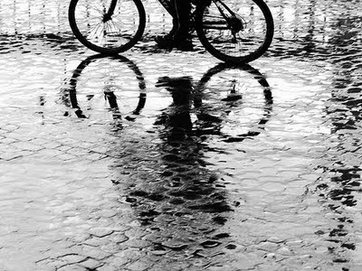 llover, ella me sostuvo la bici contra el murito de la casa, yo monté parado y