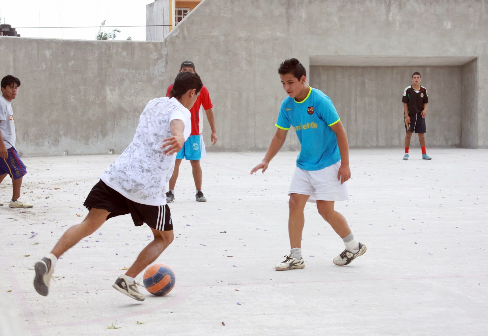 Unos amigos juegan al fútbol en un playón de cemento. Es un
