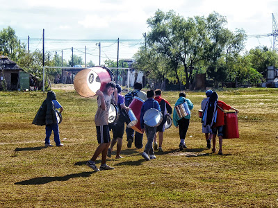 Cerca de veinte pibes le daban duro y parejo a sus instrumentos de percusión, un profesor los guiaba con un silbato, otros pequeños daban vueltas, corrían, se sentaban, miraban, hablaban y reían cómplices de un chiste o de una travesura que no demoraría en aparecer. Y todo se desarrollaba en una obra en construcción con paredes, contrapiso y ventanas, sin techo ni aberturas, pero con un proyecto que se levanta a diario. Poco le importa a los chicos de Arroyito aprender sin un techo protector, en corto tiempo ese espacio será el salón de usos múltiples y entre todos le habrán tirado una gambeta al invierno.