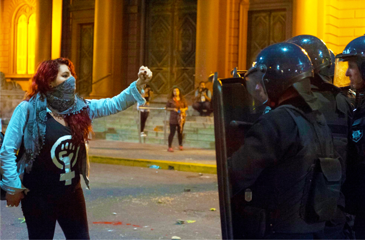 Así lo narraron en Rosario/12 las periodistas Sonia Tessa y Lorena Panzerini: “La marcha estuvo marcada por la contundencia y legitimidad de las demandas del movimiento de mujeres, que le puso el cuerpo a sus reclamos, porque no pararon de cantar durante el recorrido. Recién pasadas las 21.30 llegaron las primeras columnas a la Catedral, donde hubo balas de goma al aire, botellazos y piedrazos de un grupo de manifestantes (...) Hasta pasadas las 22 se seguían oyendo balazos de goma. Lo que contaron algunas manifestantes es que la policía mandó a la primera línea de custodia de la Catedral a policías mujeres ‘sin cascos y sin escudos’, por lo que empezaron a volar latitas y botellas, y así se habría iniciado el incidente. Más tarde, una manifestante prendió fuego un escenario de madera en Santa Fe y Laprida que todavía ardía pasadas las 22.30”.
