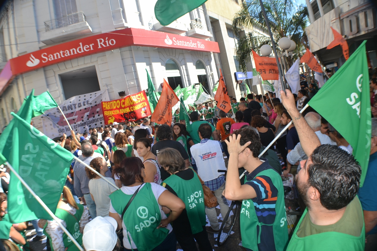 Trabajadores de la CGT, de la CTA, de la CCC y de la CTEP se movilizaron hoy en Santa Fe en el primer paro general contra el gobierno de Cambiemos. El acto central fue a la mañana en San Martín y Tucumán, donde funcionan dependencias nacionales como la Anses, el Banco Nación y la oficina local del Ministerio de Trabajo.