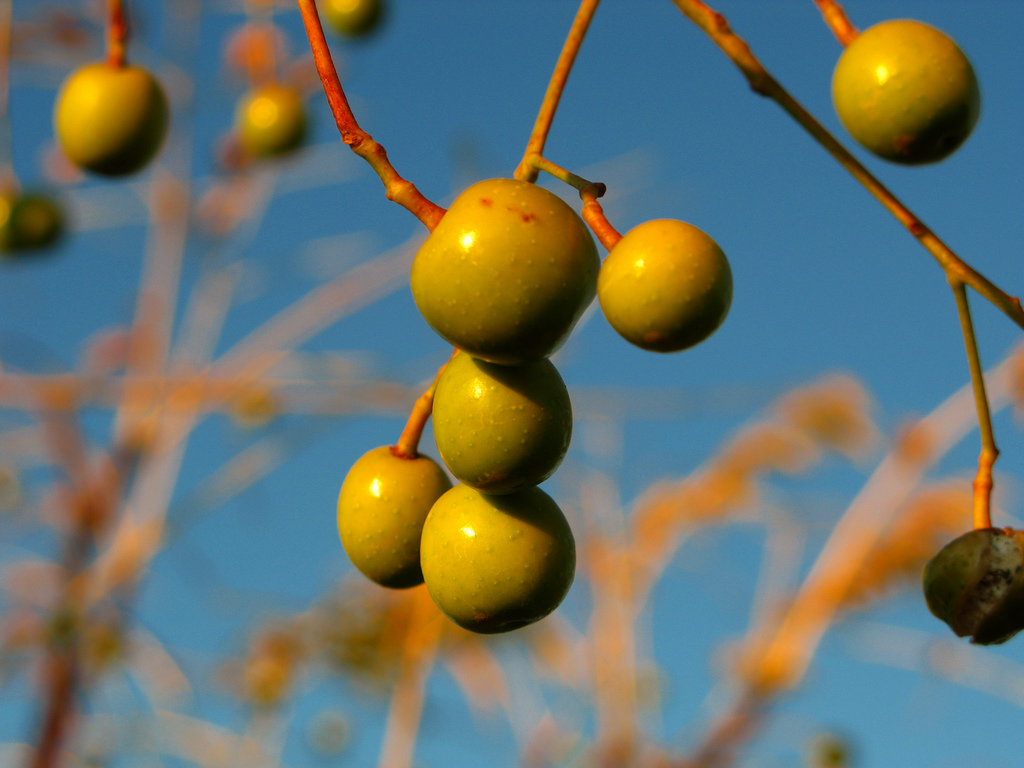 La bolita de paraíso rasgó su cáscara verde en el impacto, en el suelo se la ve, rota. Desde adentro le brota esa carne pegajosa y desagradable. El costado de la panza es un hervidero intenso y rojo, dolorosísimo, con un punto preciso que pincha y marca el centro del intenso moretón que ya empieza a dibujarse. La mano que refriega desesperada no hace más que empeorar el cuadro.