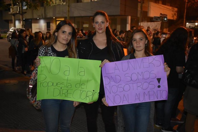 "Los centros de estudiantes han sido citados el día lunes 24 a las 14 horas, en lo que aparentaba ser una mesa de negociación, cuando sólo se trató de un explícito 'llamado a la reflexión' por parte del directorio. En otras palabras, no hemos recibido respuesta que muestre interés para llegar a un mutuo acuerdo por parte del Rector Rocchetti u otra autoridad del establecimiento educativo", así arranca un comunicado publicado ayer por lxs alumnxs autoconvocadxs y los Centros de Estudiantes de la Universidad Católica de Santa Fe. Previamente, después del encuentro del lunes 24 y también el jueves 27, los jóvenes realizaron protestas frente a la sede de barrio Guadalupe, reclamando por los aumentos en las cuotas. El comunicado culmina con furia hacia las autoridades: "Te eliminan de las planillas de asistencia si te demorás en pagar, te cobran $162 de interés si te retrasás un día, y como si fuera poco, te mandan un comunicado diciendo que para estirar el plazo de pago a 10 días más, hay que presentar una carta más los recibos de sueldo que comprueben la imposibilidad de abonar antes. ¿Y por qué no presentan ustedes sus recibos de sueldo?".