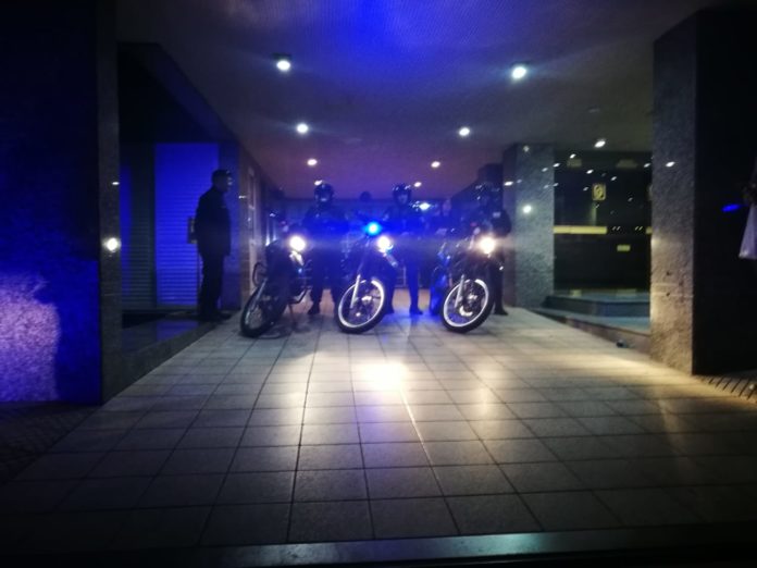 Luces azules policiales iluminan las puertas del hotel Río Grande. En la entrada principal, sobre calle San Jerónimo, un operativo es el centro de atención en el búnker de Cambiemos.
