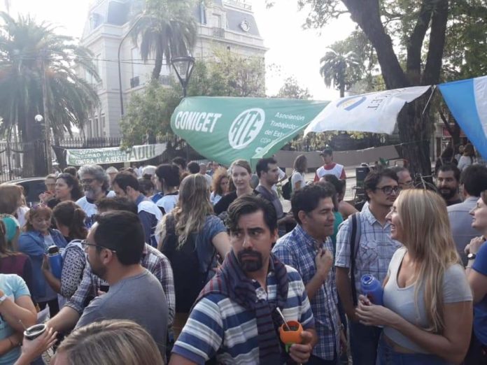 En el marco de las discusiones paritarias, los docentes universitarios nucleados en ADUL (CONADUH) continúan en estado de alerta y movilización. El miércoles 10, mientras participaban junto a becarios e investigadores del CONICET de la Jornada de Lucha por la baja de ingresos a ese organismo, el gobierno nacional convocó a la primera reunión paritaria 2019, luego de cerrar (con dos meses de atraso) la paritaria 2018. No hubo ofrecimiento salarial: las autoridades del Ministerio de Educación se limitaron a escuchar las demandas de las federaciones docentes, y establecieron el 22 de abril como fecha para la próxima reunión. “Nuestra pretensión es un 35 % de aumento, más cláusula gatillo, y el pase al básico de todas las sumas en negro”, informó Viviana Pradolini, Secretaria Adjunta de ADUL.