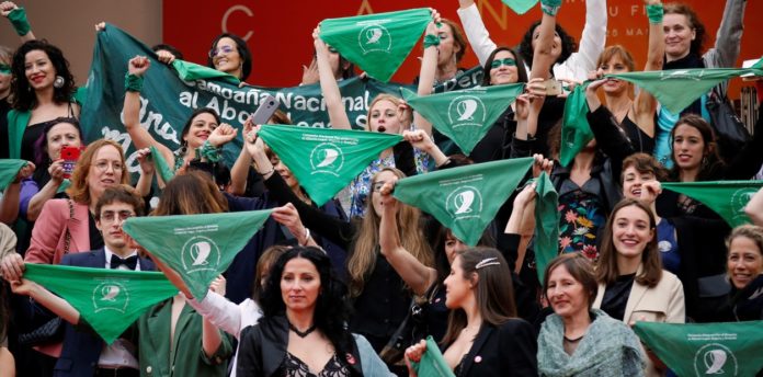 En la previa de la proyección del documental del argentino Juan Solanas, Pedro Almodóvar y Penélope Cruz, director y protagonista de "Dolor y gloria", lucieron el pañuelo verde por la Campaña Nacional por el Derecho al Aborto Legal, Seguro y Gratuito junto a muchos otros artistas.