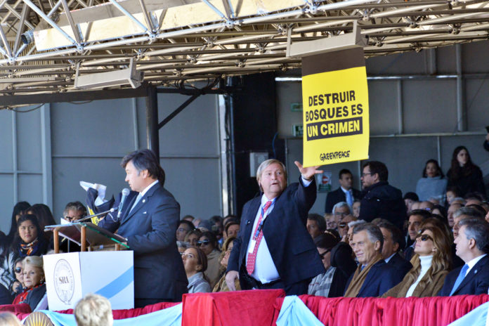 Más llamativa resultó la intervención de Greenpeace. Mientras iniciaba el discurso del titular de la Sociedad Rural, lograron desplegar dos carteles con las siguientes consignas: “Ganaderos: basta de desmontes”, en relación a la descontrolada expansión de la ganadería intensiva que para los ambientalistas implica la extinción del yaguareté, y otro que rezaba “Destruir bosques es un crimen”, en referencia a la destrucción de los bosques nativos para la expansión agropecuaria.