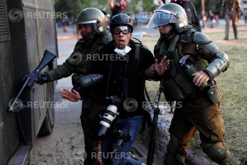 Por la tarde de ayer, el fotógrafo argentino Pablo Ernesto Piovano –reconocido internacionalmente por su labor de denuncia de los efectos de los agrotóxicos– publicó en su cuenta de Facebook una foto registrando la detención del fotógrafo argentino Jeremías Gonzales, quien fue apresado con el fotógrafo freelance Alvaro Santana. Ambos fueron trasladados a dependencias policiales de Santiago de Chile. Gonzáles fue liberado hoy, cerca de las 8 de la mañana, según informa Piovano.