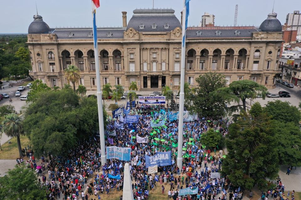 En la primera movilización gremial de carácter provincial contra el gobierno de Omar Perotti, los docentes de Amsafe y Sadop reclamaron un aumento salarial que se ubique por encima de la canasta familiar y rechazaron, con fuertes críticas, las dos primeras propuestas que recibieron de parte del Ejecutivo. Durante el acto principal, realizado este jueves al mediodía en la Plaza 25 de Mayo, los docentes lanzaron una consigna clara: “No al ajuste”.