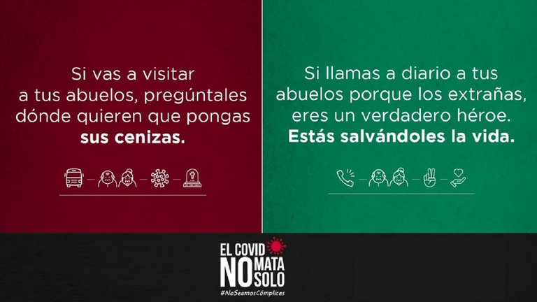 “Si vas a visitar a tus abuelos, pregúntales dónde quieren que pongan sus cenizas”, indica otro de los afiches que busca reducir las reuniones familiares. Los mensajes están siendo divulgados en TV, radio, vía pública, redes sociales y otras intervenciones urbanas.