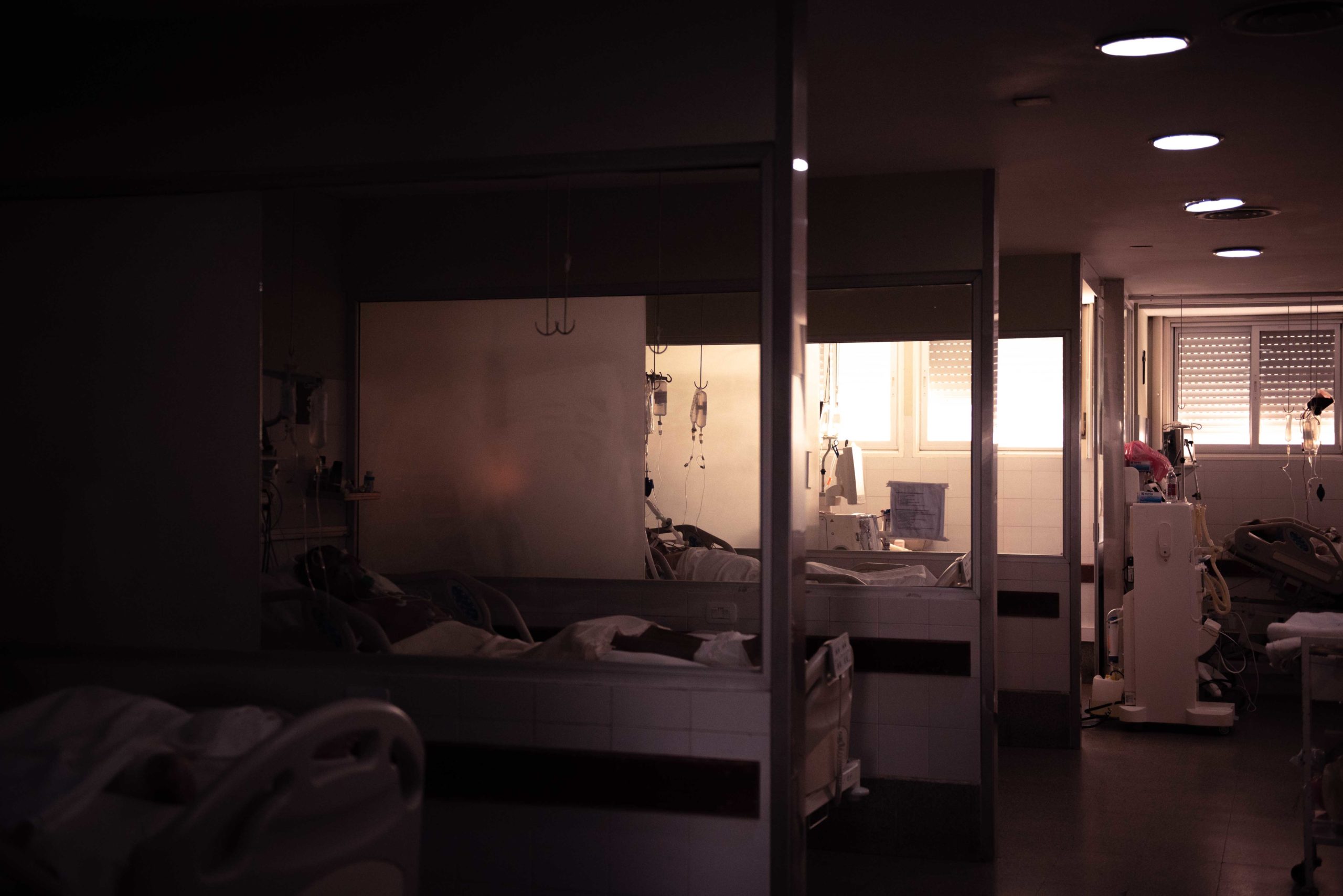 Una al lado de otra, separadas por mamparas, están las camas, las vidas. Cada paciente oye lo que pasa en la sala, pero no puede ubicar del todo dónde está pasando eso que escucha mientras mira todo el día el mismo techo, las mismas máquinas, la misma mampara.