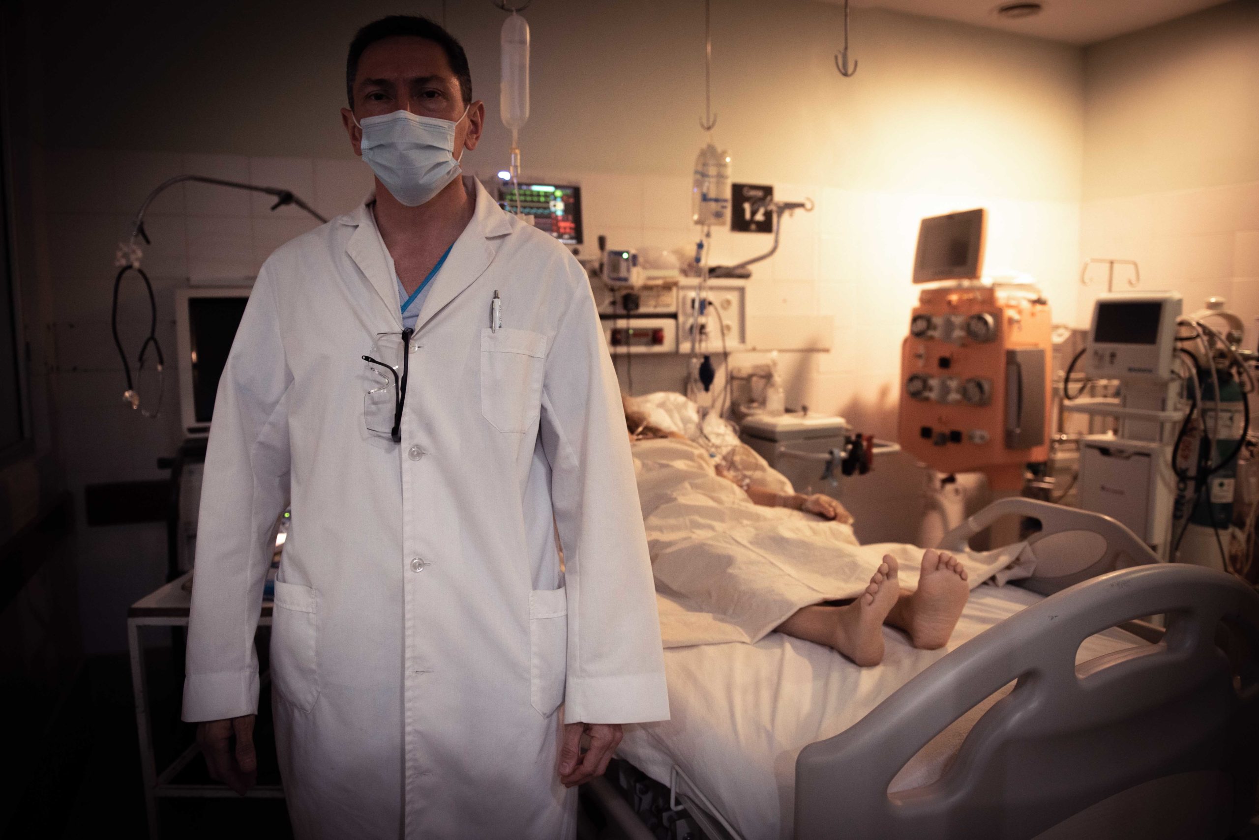 Al fondo de la sala de terapia intensiva para pacientes con Covid 19 está la salvación. El equipo de médicos del Hospital Cullen se desplaza suavemente de cama en cama, entre la repetición mecánica de los bips y el sonido regular de los fuelles de aire. Los pacientes yacen y se mueven mínimamente, estiran un poco una pierna y la traen, giran la cabeza de un lado al otro y otra vez, se acarician la mano. Miran. Los medidores de saturación de oxígeno en sangre les aprietan los dedos, las cintas que ciñen los distintos soportes respiratorios a la nariz lentamente van haciendo un surco en las mejillas. Ese surco se siente como una mueca de sonrisa de payaso, que no se va.