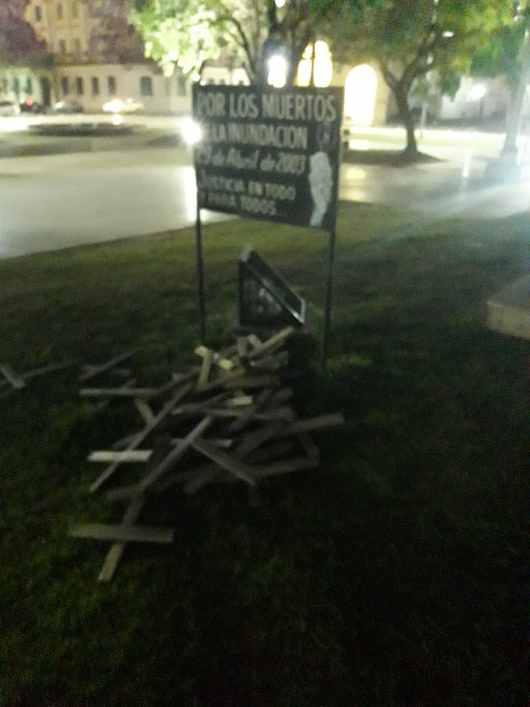 Tras la marcha por el fin de la cuarentena que se realizó ayer por la tarde en la Plaza 25 de Mayo, comenzó a circular una foto donde se ven, rotas y arrancadas, las cruces de madera que conmemoran las muertes de la inundación. Las personas que atacaron la intervención aún no fueron identificadas; esta mañana integrantes de la Marcha de las Antorchas se acercaron a la plaza para reponer los destrozos.