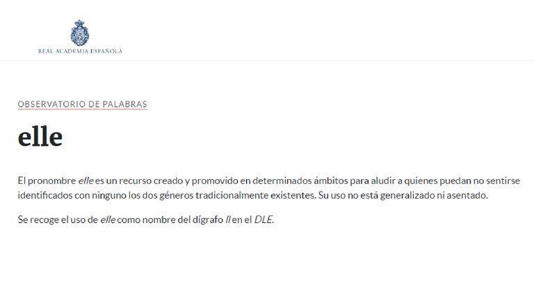 Esta semana la RAE incorporó el pronombre "elle" a su Observatorio de palabras. Este espacio, según se explica en el sitio web de la Academia, "ofrece información sobre palabras (o acepciones de palabras) y expresiones que por el momento no aparecen en el diccionario, pero que han generado dudas: neologismos recientes, extranjerismos, tecnicismos, regionalismos, etc. Esta información es provisional, pues no está contemplada aún en las obras académicas, por lo que puede verse modificada en el futuro. La presencia de un término en este observatorio no implica que la RAE acepte su uso".