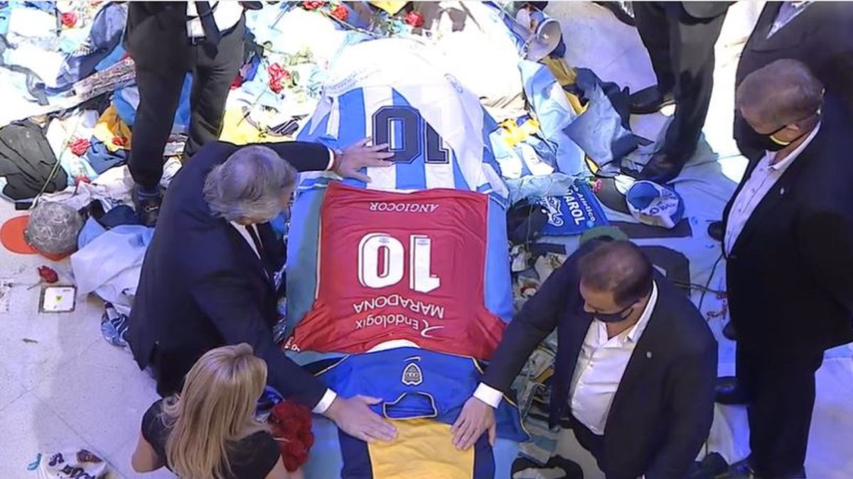 El Presidente dejó sobre el féretro una camiseta de Argentinos Juniors y el pañuelo de las Madres de Plaza de Mayo. Diego será velado hasta las 16 horas en la Casa Rosada.