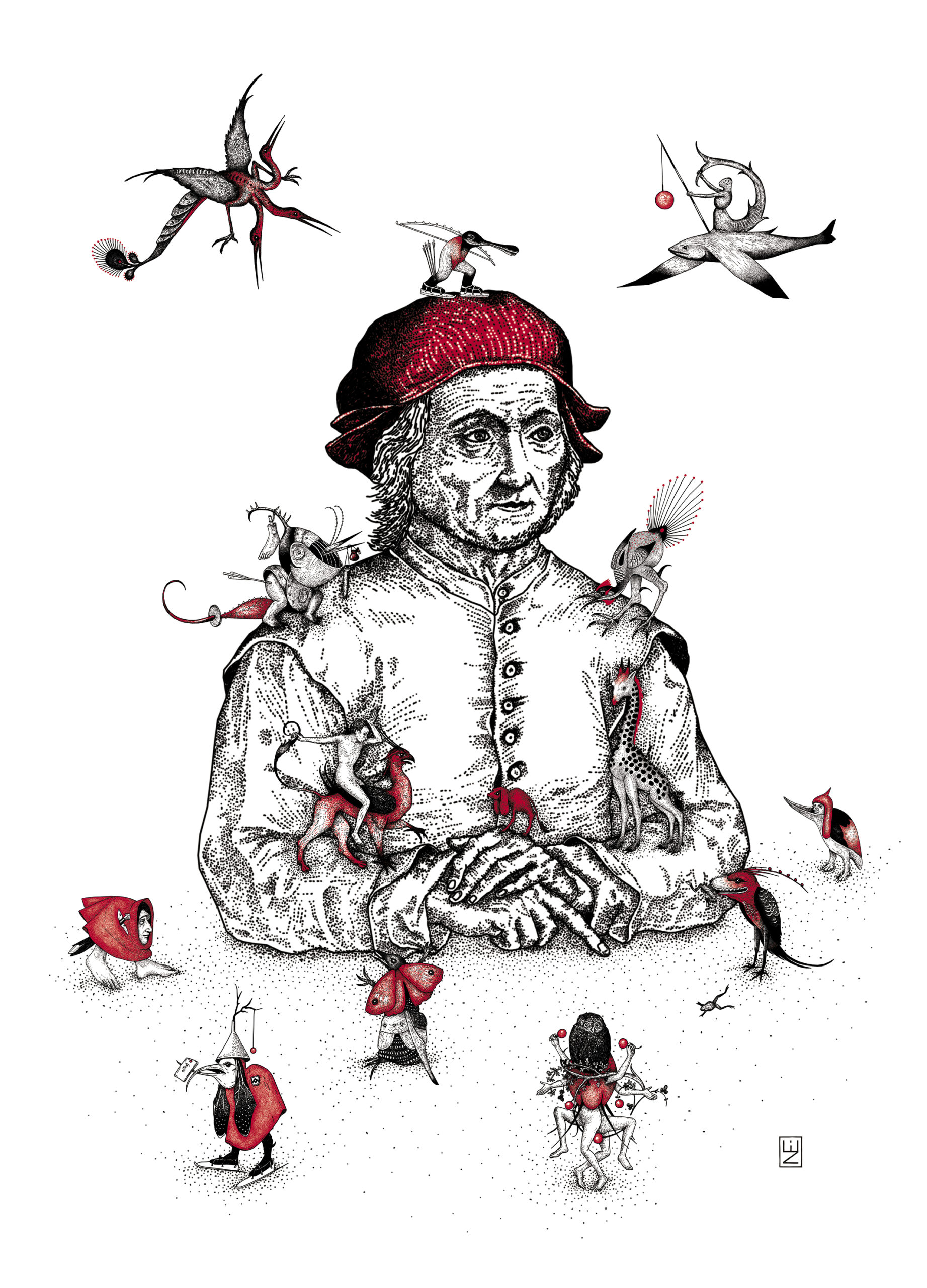 Hoy, en esa tarea de larga observación se ha producido una novedad. De la mano de una artista puntillosa que sabe honrar la grandeza del detalle, las figuras fantásticas de El Bosco se han salido de los jardines que las vieron nacer. Mariela Benítez, la Negra, o la Ne, dibuja meticulosamente esos bichitos y hace una jugada audaz: los despega de los entornos en los que habitan. Se salieron también, entonces, de la tabla de roble y andan circulando en su nueva superficie. Los seres recreados por la Ne han renacido, repitiendo lo que fue, en verdad, su origen: integrarse a un Renacimiento del mundo todo.