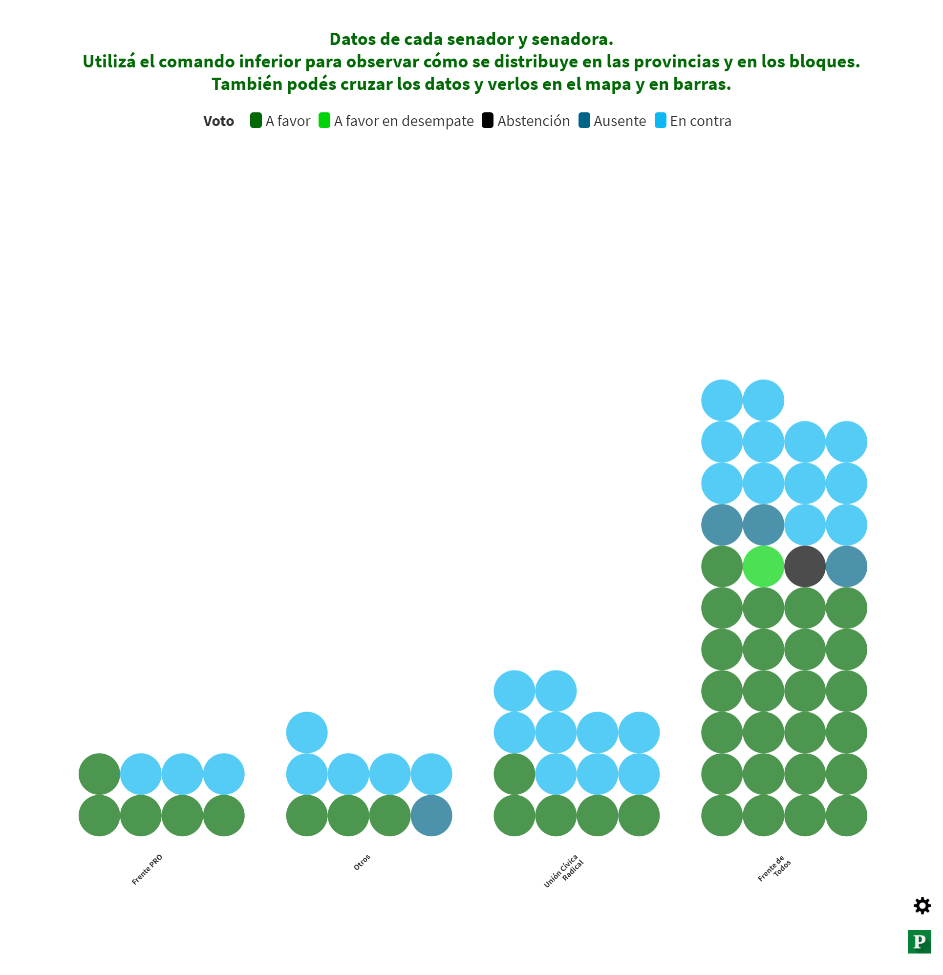 En términos absolutos, como sucedió en la Cámara de Diputados, el mayor aporte de votos a favor provino del Frente de Todos (25, mientras que 12 votaron en contra, uno se abstuvo y tres faltaron). Luego, el resto de los agrupamientos políticos tuvieron mayoría celeste, excepto el Frente PRO, pero por poco: cinco a favor, tres en contra.