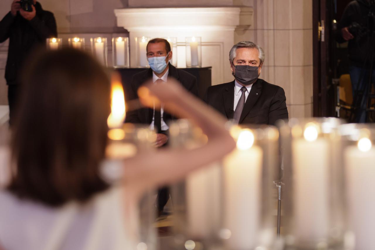 El presidente Alberto Fernández encabezó este mediodía junto a la primera dama, Fabiola Yañez, en el Centro Cultural Kirchner, una ceremonia en homenaje a los fallecidos por el Covid-19 de la que participaron representantes de los diversos credos del país, de los trabajadores esenciales, de pueblos originarios y de la comunidad afroargentina, los gobernadores y el jefe de Gobierno porteño.