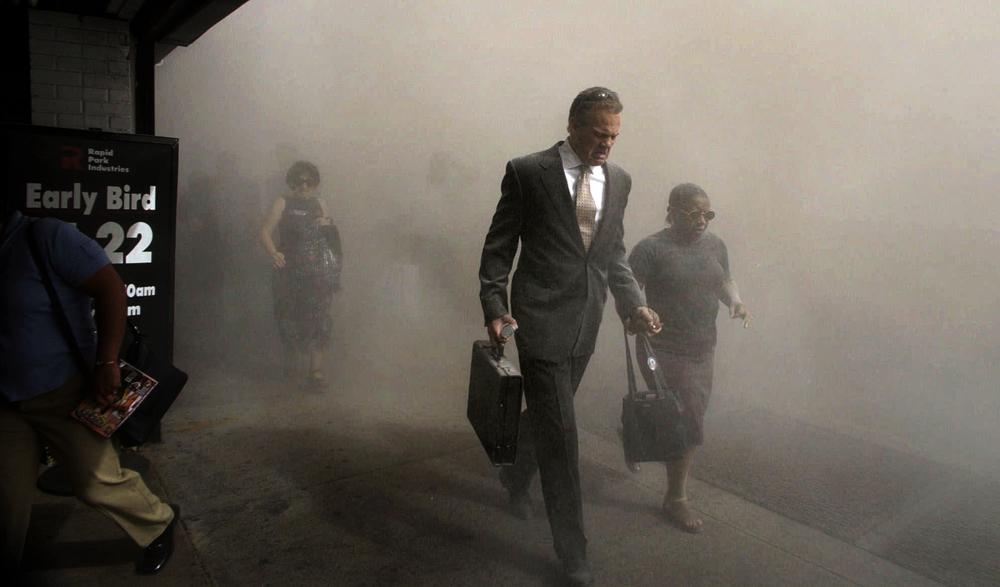 Las escenas callejeras muestran un horror creciente mientras la gente mira fijamente y llora ante los rascacielos en llamas, y luego huye de la nube de polvo que se eleva a través del bajo Manhattan después de que uno de ellos se desmorona. Las llamas se disparan desde las ventanas del Pentágono, el símbolo mundial de las fuerzas armadas que podría resultar vulnerable a un ataque de un puñado de agresores. Una forma humana que cae, casi recortada contra una de las torres del centro comercial, muestra uno de los horrores más agonizantes de todos.