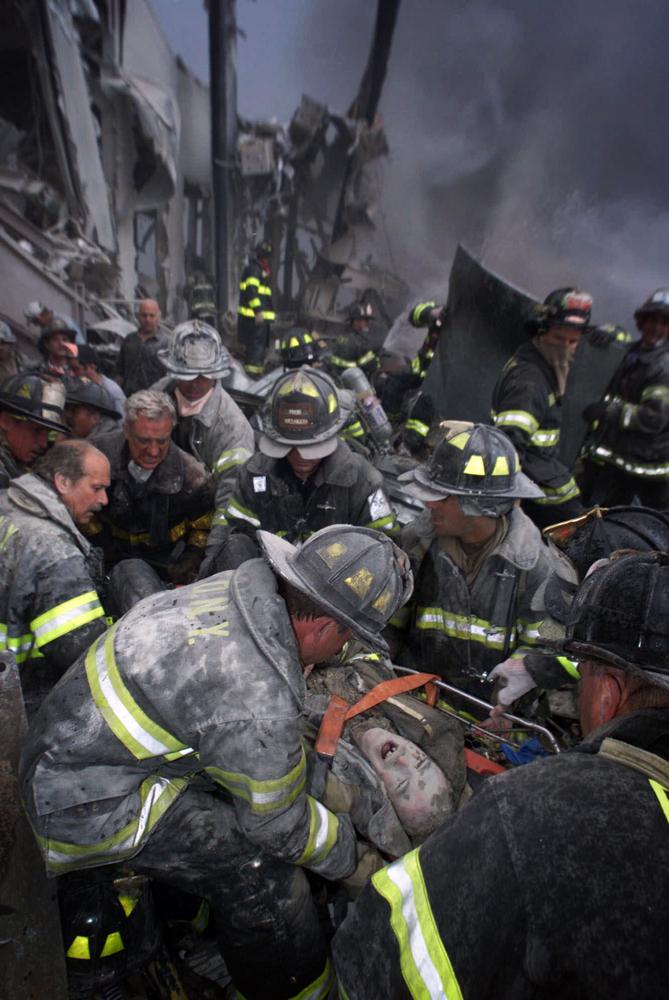 Algunos muestran visiones más íntimas del dolor, pero también de humanidad: la cara gritando de un bombero herido; una mujer que camina a través de la espeluznante ventisca de los escombros del centro comercial con su brazo alrededor del hombro de otra persona; el entonces subjefe de la Reserva del Ejército, el coronel Malcolm Bruce Westcott, sosteniendo una mano sobre la frente de la empleada del Pentágono, Racquel Kelley, mientras la evaluaba para ver si estaba conmocionada. Hay imágenes de determinación, incluidos los bomberos trabajando en medio de los escombros humeantes y un comerciante barriendo el polvo de la catástrofe.