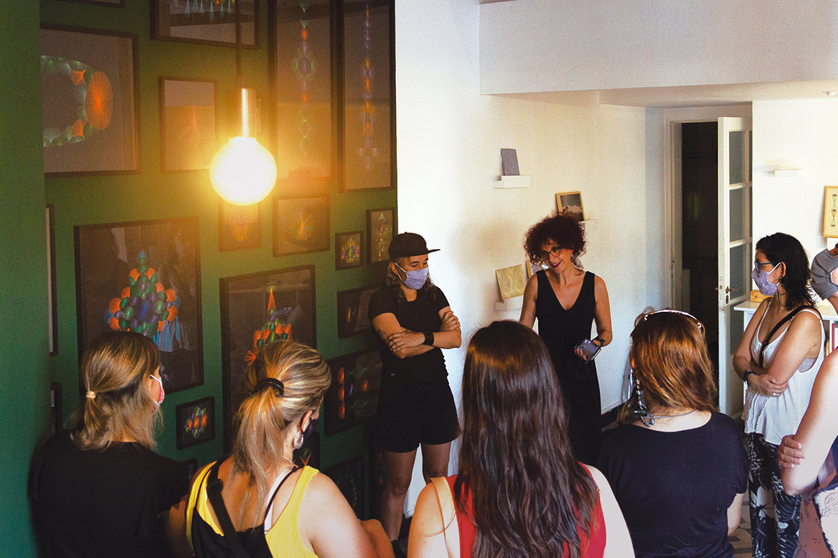 El día de la muestra hacía mucho calor. Delta estaba rebosante. Se fue poblando de a poco, yo fui una de las primeras en llegar y el hecho de ir con mi hijo permitió que no estuviera del todo concentrada en la experiencia artística, sino que el lazo con la expectación fuera y viniera, en random (es un modo privilegiado de ver las cosas, un pie acá y otro también allá). La artista iba y venía entre los presentes y dejaba un pequeño rastro explosivo: Mauge hablando de su enfermedad, Mauge llorando, Mauge contando a un grupo de personas la técnica de sus obras, Mauge agradeciendo, Mauge temblando, Mauge tomando cerveza, Mauge saltando de alegría. Un escarabajo que busca el núcleo de pica y luz, batiendo caparazones hacia la luz, entre la gente.