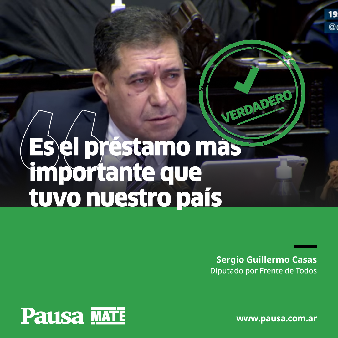 El diputado del Frente de Todos, Sergio Guillermo Casas, dijo "Estamos tratando una deuda contraída por el gobierno de Mauricio Macri. Es el préstamo más importante que tuvo nuestro país". Esa afirmación es verdadera en general y en particular.