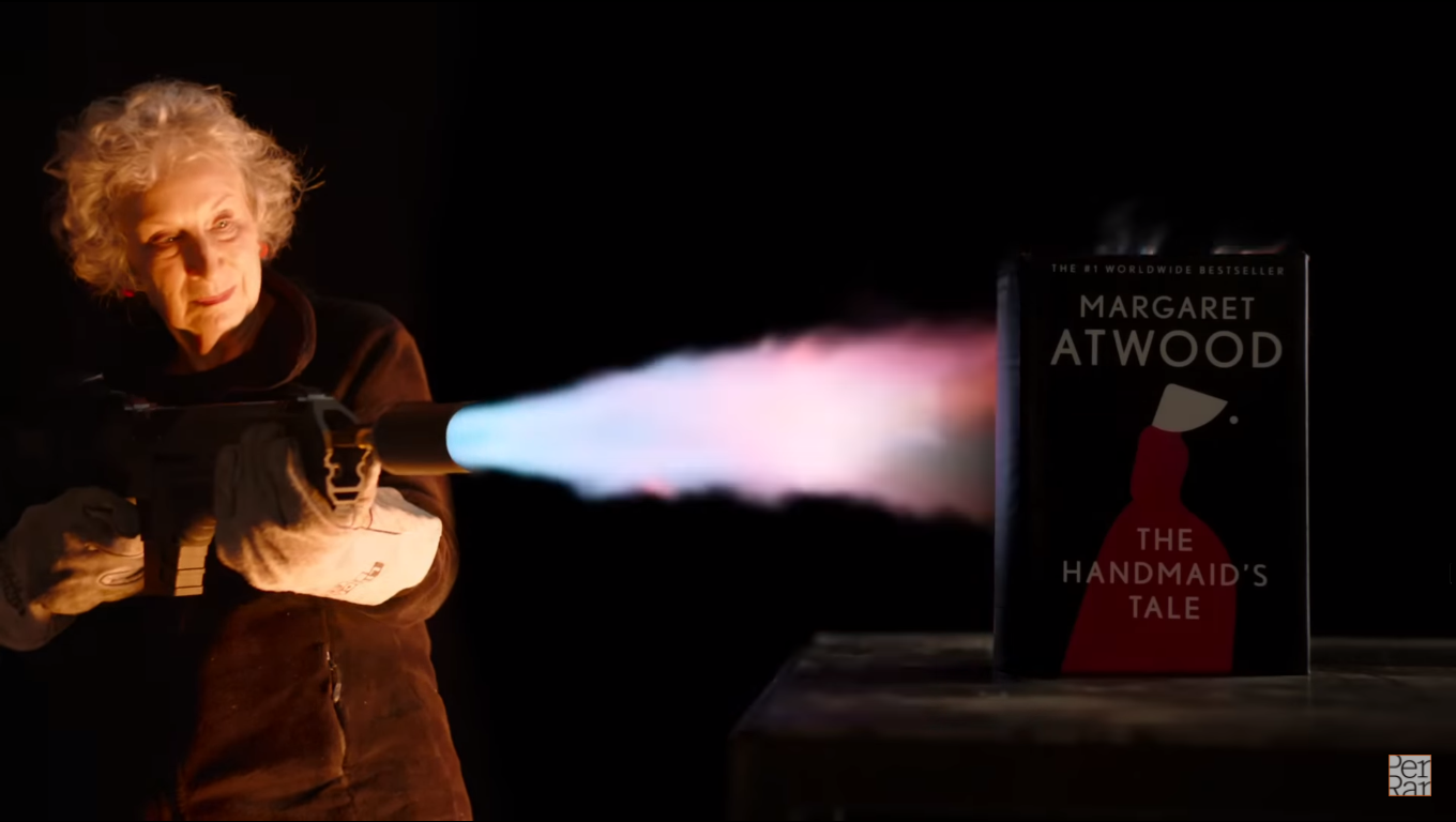La misma Atwood aparece en un video realizado por la editorial equipada con un lanzallamas y tratando de quemar este libro incombustible, sin éxito, “porque las palabras poderosas no pueden destruirse”, dice el vídeo.