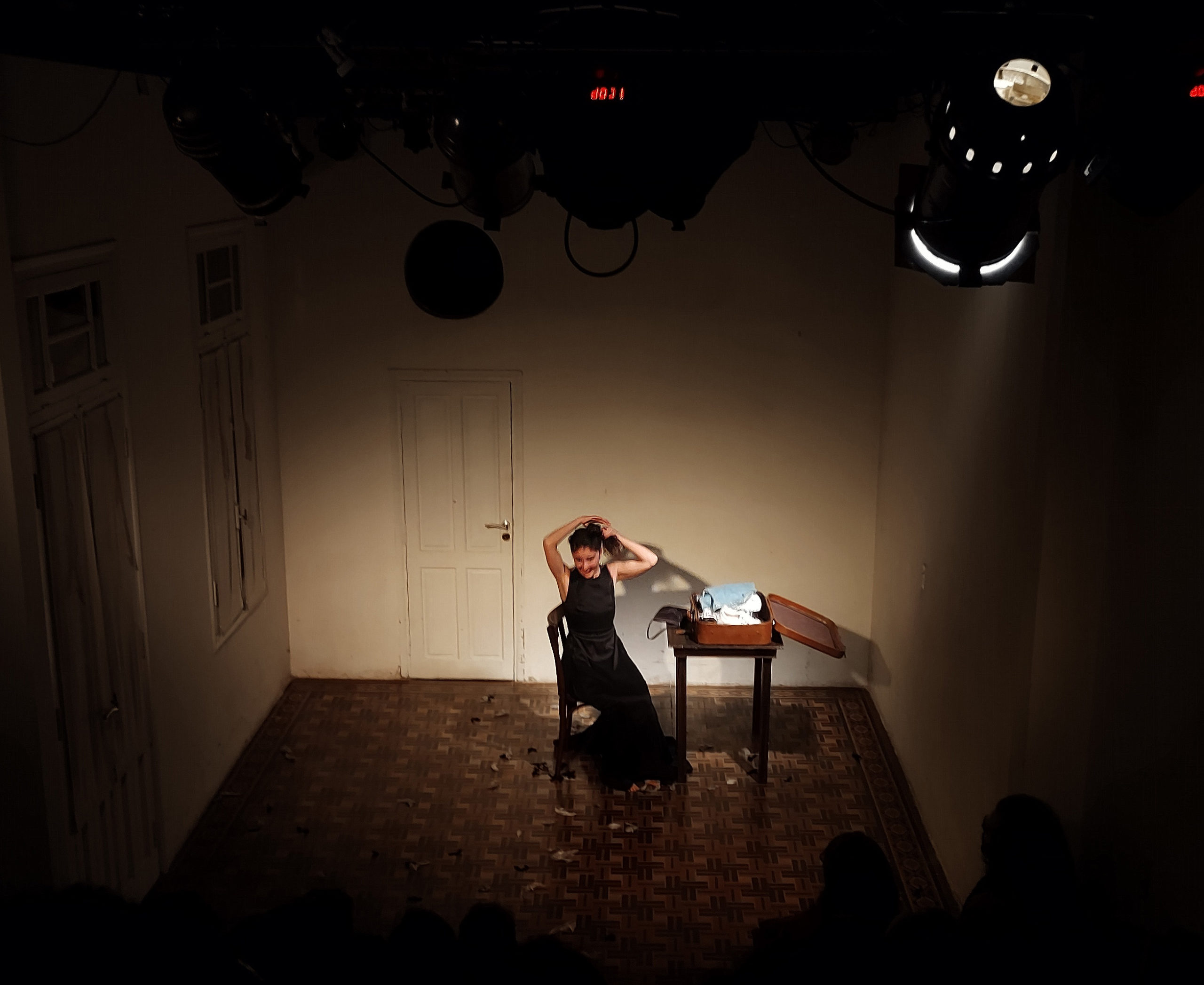 Ya desde el comienzo Violeta-personaje deja claro que está tratando de fortalecer su eje, de formar su identidad como artista. Es una joven con una valija que, a lo mejor, representa a la tradición, que no es nada menos que una herencia y uno de los temas que se van a problematizar en la puesta. Apenas toca la maleta provoca una lluvia de plumas. Con la vista busca, entre asustada y perdida, un faro que la guíe en su viaje.