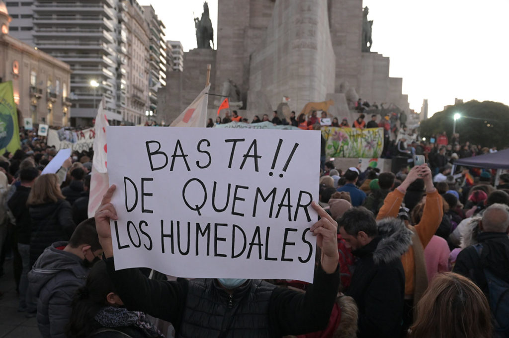 Los humedales cubren el 21,5% del territorio argentino y son de gran importancia ambiental por la enorme biodiversidad que albergan y el rol fundamental que cumplen en la regulación del clima. “Son un gran reservorio de agua dulce y ayudan a absorber el carbono”, aporta Suárez, y se explaya sobre las quemas en el delta del Paraná que, una vez más, amenazan su integridad: “Los incendios son prácticas extractivistas que contribuyen al enriquecimiento de unos pocos, y con ellos se seca la vegetación, se pierde biodiversidad, se aniquilan animales, vegetales y árboles y todo eso provoca un mayor calentamiento climático”. Para las organizaciones que convocan a la marcha en defensa de los humedales, los incendios tienen responsables claros: “los agronegocios, las grandes obras de infraestructura y los proyectos inmobiliarios”, que simbolizan “el modelo extractivista sobre nuestros cuerpos- territorios”, señala el comunicado de invitación a la marcha.