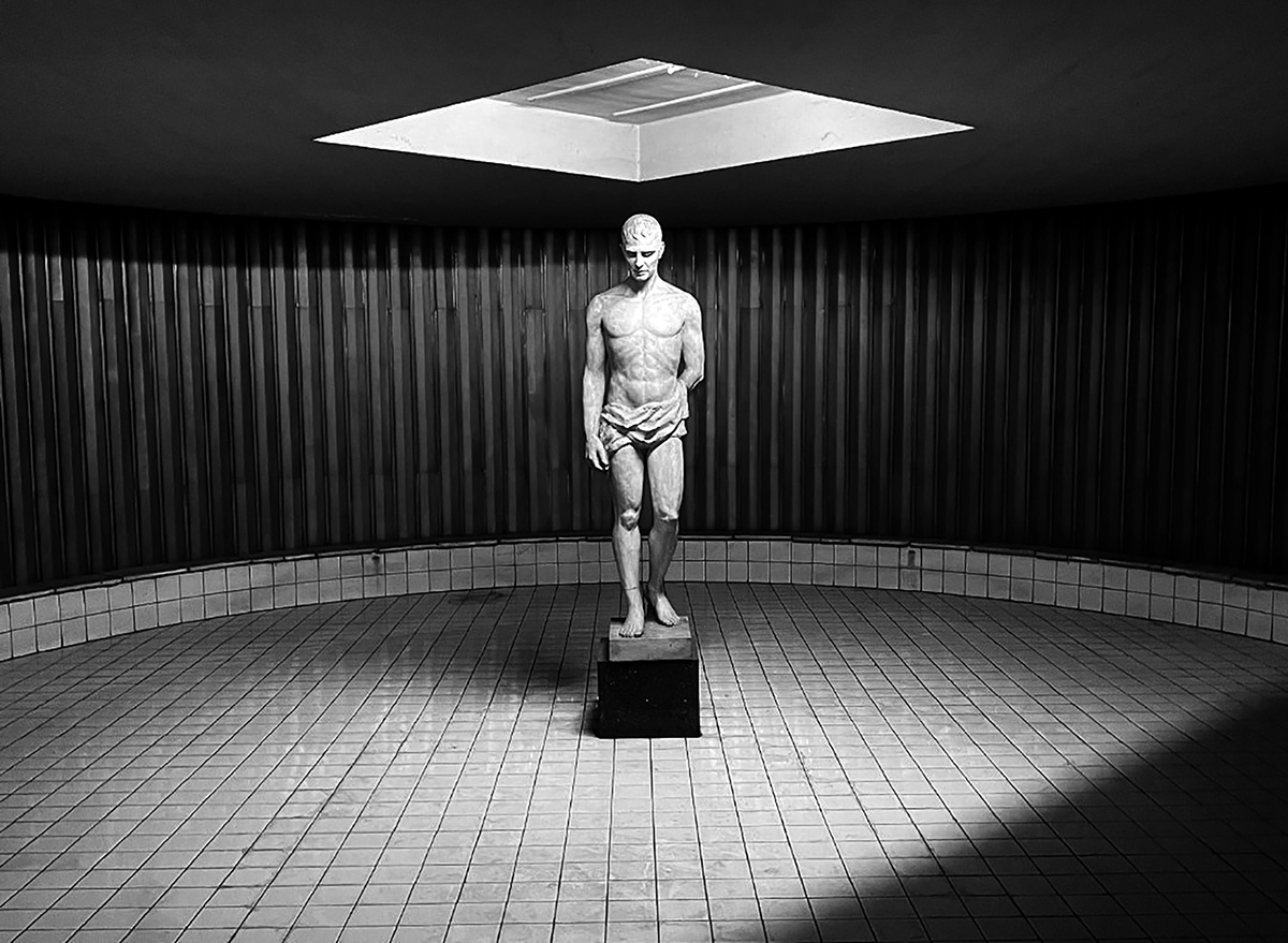 La última noche, con mi amiga Daniela y su hija Cora, entramos a ver el Garaje Apolo, la extraña construcción de 1963 en calle Sarmiento, a media cuadra del bar. Una estatua blanca del dios Apolo se recorta en el fondo del garaje, en el medio de una fuente sin agua ni peces, espejada de mosaicos de loza azules. De lejos, el fondo rojo parece un cortinado de guipure, de cerca es un revestimiento fijo. Parece una escena para una película de Lynch. Los autos entran y salen por los accesos laterales de esta instalación, pero a la hora de la noche que entramos, no hay movimiento. Le pedimos permiso al guarda de la entrada, quien asiente, divertido, y nos sacamos fotos.