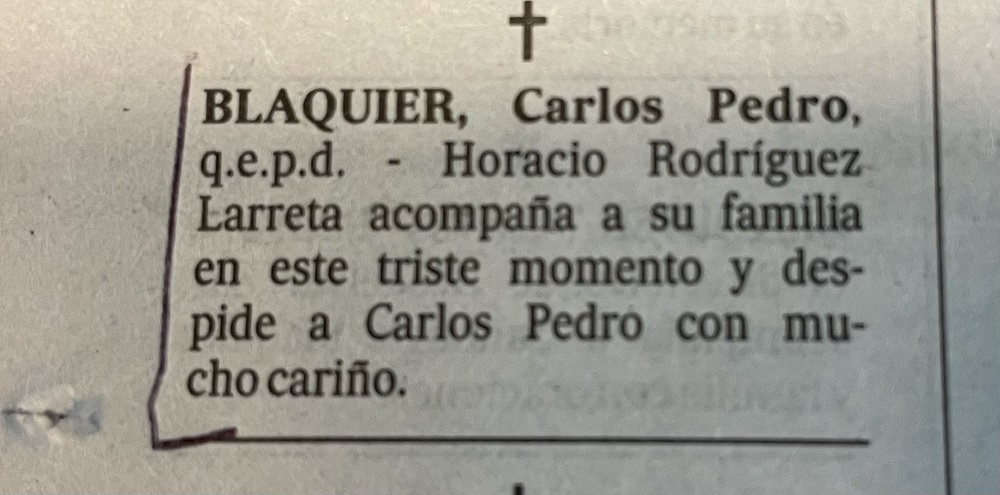 - BLAQUIER, Carlos Pedro. - Con profundo dolor lo despido y hago extensivo mi pesar a su familia y seres queridos. Mario V. Falak. (Vaciador del Banco Mayo durante el menemismo)