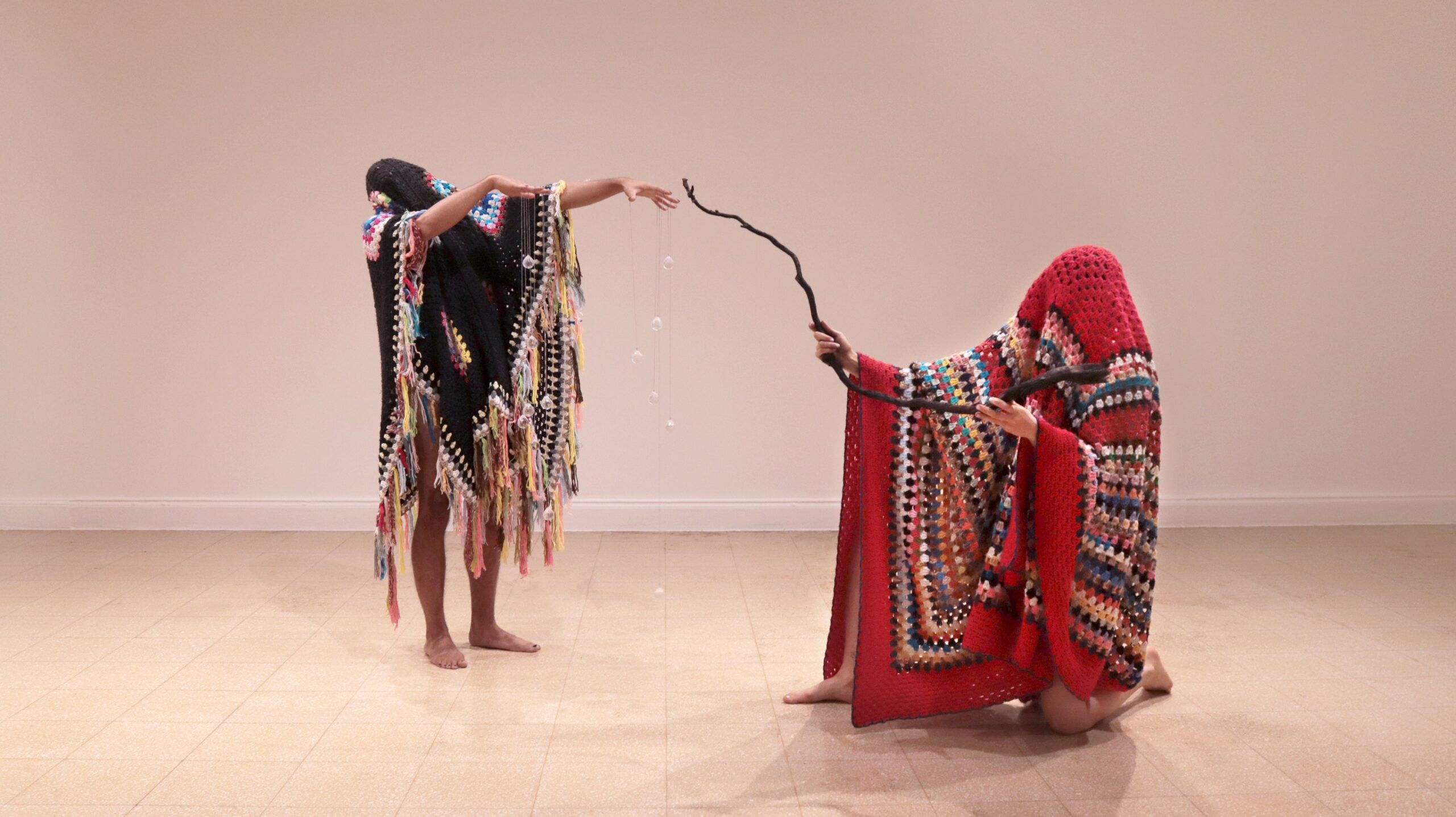 Con una duración de entre 90 y 180 minutos, las y los performers trabajan cubiertos por mantas tejidas al crochet. Para esta pieza utilizan una rama carbonizada de un incendio en Esquel y esferas facetadas.