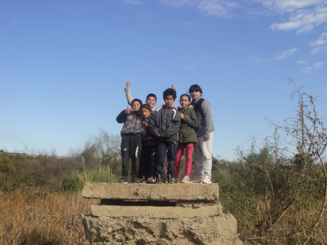 A medida que avanza la charla, la cámara, que al principio estaba guardada en uno de los estantes, comienza a pasar de mano en mano, mientras la ansiedad de les niñes por el inicio de la recorrida por el barrio va en aumento. Quieren salir a sacar fotos y están ilusionades con mostrarme su lugar favorito para jugar, al que llaman “el paraíso”. Finalmente salimos. Yendo hacia el fondo del barrio, atravesando una laguna de residuos cloacales, está el paraíso, un gran espacio verde con agua estancada y basura en el piso, lindero con la Avenida Circunvalación. Antes el lugar estaba completamente deshabitado, me cuentan, pero ahora, con el crecimiento de la población del barrio, fueron apareciendo algunos ranchos de chapa. Les pibis corren y desaparecen rápidamente de nuestra vista detrás de los altísimos yuyos. Cuando vuelven, sus ropas ya están embarradas: “¡Hay pájaros nuevos! ¡Flamencos! ¡Estoy re emocionado!”, grita uno de ellos, feliz.
