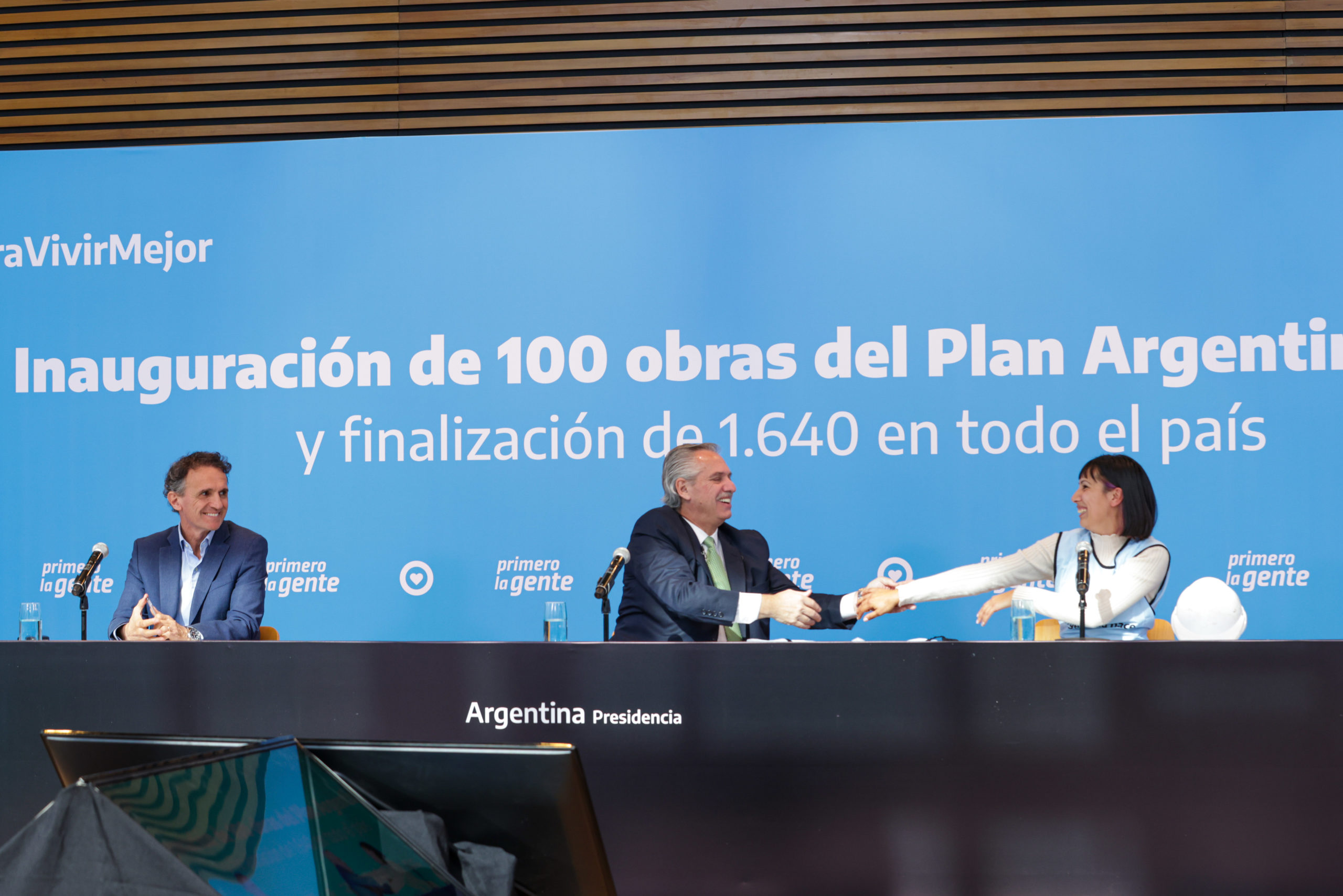 El presidente Alberto Fernández inauguró este mediodía junto al ministro de Obras Públicas, Gabriel Katopodis, 100 obras en 100 localidades de las 23 provincias del país, a través de una inversión de más de 5.500 millones de pesos, con las que se alcanzaron las 1.640 obras finalizadas en el marco del Plan Argentina Hace.