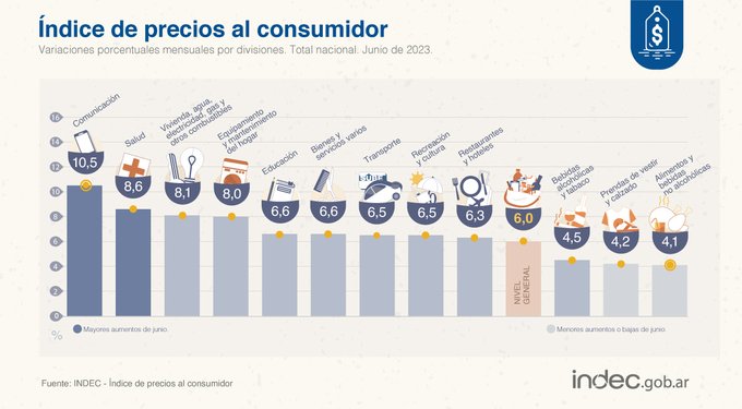 Durante el sexto mes del año, el rubro de mayor aumento fue Comunicaciones, con una suba de 10,5%, impulsado por los servicios de telefonía e internet. En orden de aumento, siguen los rubros Salud, Vivienda, agua y comestibles.