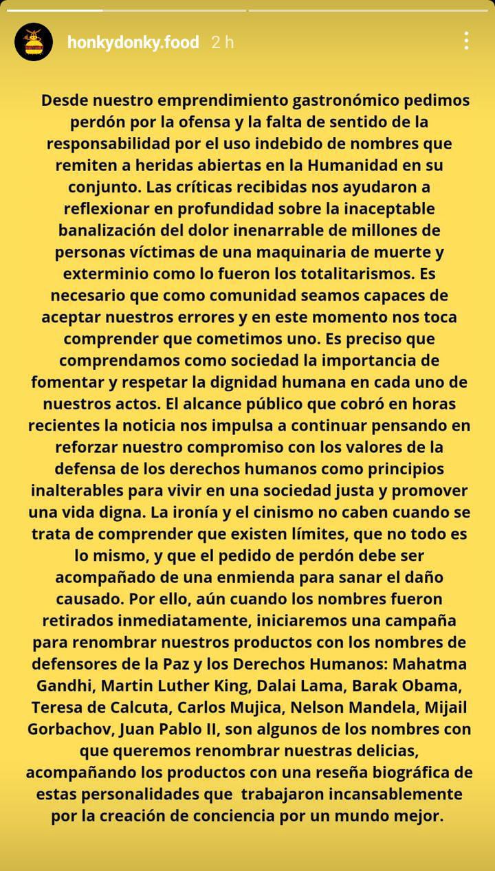 "Desde nuestro emprendimiento gastronómico pedimos perdón por la ofensa y la falta de sentido de la responsabilidad por el uso indebido de nombres que remiten a heridas abiertas en la Humanidad en su conjunto. Las críticas recibidas nos ayudaron a reflexionar en profundidad sobre la inaceptable banalización del dolor inenarrable de millones de personas víctimas de una maquinaria de muerte y exterminio como lo fueron los totalitarismos", expresaron en una historia de su cuenta de Instagram.