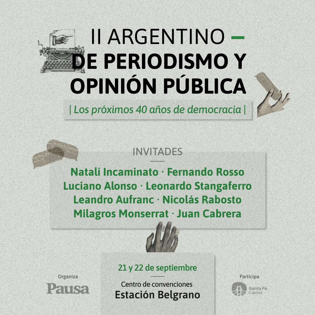 El II Argentino de Periodismo y Opinión Pública se realizará los próximos 21 y 22 de septiembre en la Estación Belgrano, en el marco de la Feria del Libro de la ciudad. Este encuentro, organizado por el Periódico Pausa con el apoyo de la Municipalidad de Santa Fe y ADUL (Asociación de Docentes de la Universidad del Litoral), busca ser un espacio de debate y reflexión en torno al 2023 como fecha significativa: 40 años de democracia cumplidos, 40 años de democracia por venir.