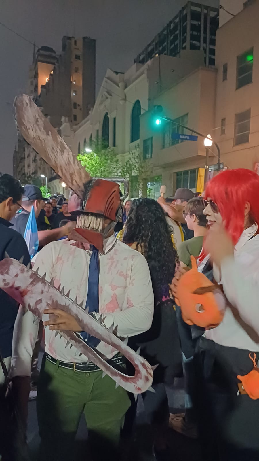 El búnker libertario también está bastante concurrido, aunque no tanto como el de Massa. A simple vista, si bien hay bastantes pibes, el grueso del público es más o menos treintañero. Empiezo a recorrer el lugar y rápidamente van apareciendo en mi camino las imágenes lisérgicas con las que esperaba encontrarme. Un transformer amarillo gigante baila al ritmo de los bombos. Un pelado que probablemente haya sido un servicio de inteligencia sostiene un cartel que reza: “Los hombres tenemos derechos. Basta de falsas denuncias. No juzguen con perspectiva de género”. A pocos pasos, una pareja posa para la foto: ella tiene una peluca roja y él tiene una máscara de motosierra y otra motosierra (de juguete) en la mano. La pelirroja sonríe y mira alrededor ingenuamente, como si hubiera ido simplemente a pasar un buen rato. Se llama Evelyn, tiene 23 años y vino “primero para acompañarlo a él” (a la motosierra humana) “y después, si bien no soy militante ni fan de los políticos, porque quiero tener un poquito de fe”. “Los anteriores gobiernos tuvieron sus oportunidades y no se manejaron tan bien, así que vamos a ver qué onda con este, si hace las cosas bien vamos a seguirlo”, agrega.