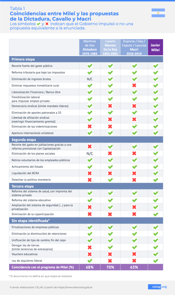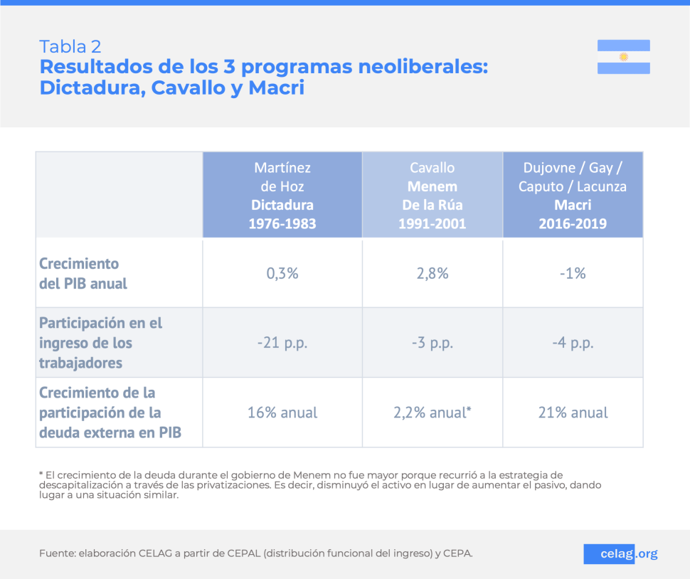 En una segunda tabla, Celag resume algunos resultados económicos de los gobiernos anteriores que implementaron las mismas políticas propuestas hoy por Milei.