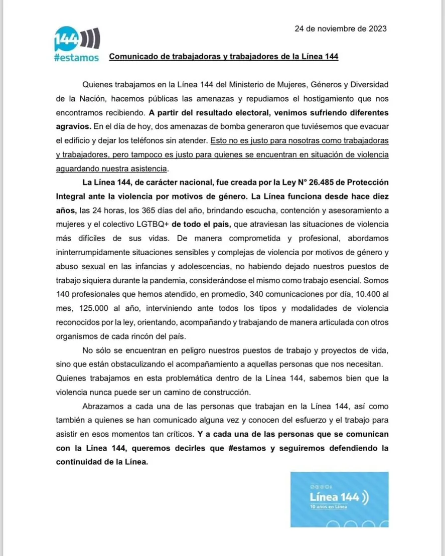 Tras las amenazas que recibió el Ministerio de Mujeres, Géneros y Diversidad de la Nación, las trabajadoras de la Línea 144 compartieron un comunicado: "Esto no es justo para nosotras como trabajadoras y trabajadores, pero tampoco es justo para quienes se encuentran en situación de violencia aguardando nuestra asistencia", sostuvieron.