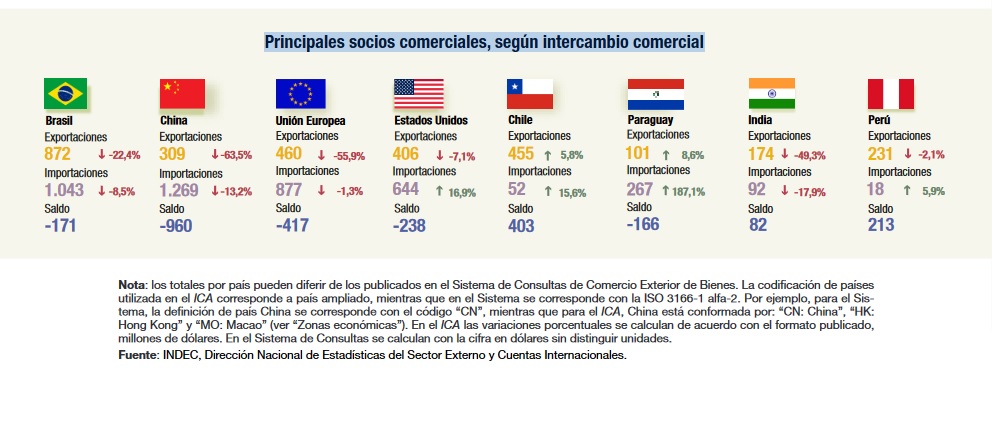 Pero no termina ahí: el último informe publicado por el INDEC sobre "Intercambio comercial argentino", en el período comprendido de Enero a Noviembre de 2023 Argentina exportó a Brasil, China y la India por un total de más de US$18.000 millones. Esos tres países se ubican entre los que el propio gobierno argentino entiende como sus "Principales socios comerciales, según intercambio comercial".